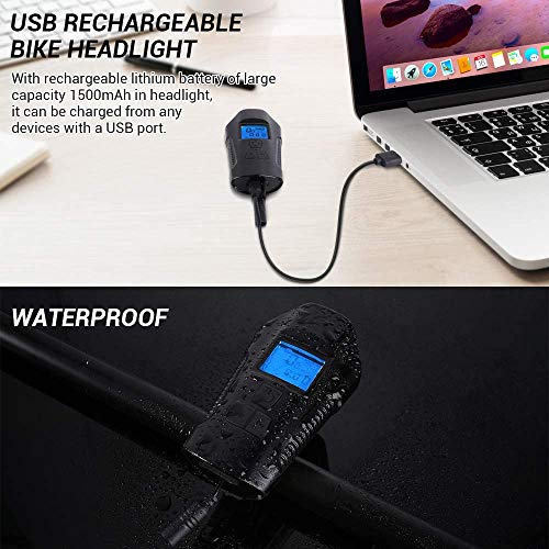 【USB Rechargeable Bike Headlight】– With rechargeable lithium-ion internal battery of large capacity 1500mAh in the headlight. it can be charged from any device with a USB port. Lasting 5-8 hours when full-charged. Compared with ordinary batteries. saving money and environmental friendly.