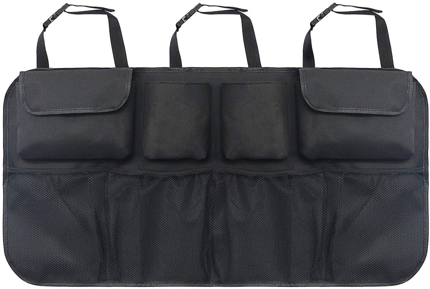 Car Trunk Organizer: Folding storage trunk organizers with adjustable straps to fit all headrests so that your clutter and car stuff can be placed in the mesh pockets giving you extra trunk space and stops things from rolling around. The perfect car pocket organizer for you!