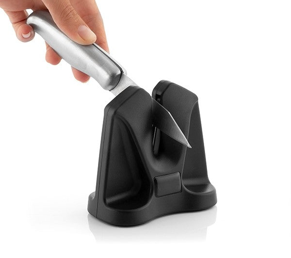 An effective manual sharpener with V-shaped design that enables all types of knives to be polished and sharpened (smooth blade. serrated blade. Japanese. etc.). It is very simple to use and. depending on the angle. it achieves a coarse or fine sharpening. In addition. it provides optimum results with just a few strokes. easily achieving a professional finish that extends the useful life of the knives.