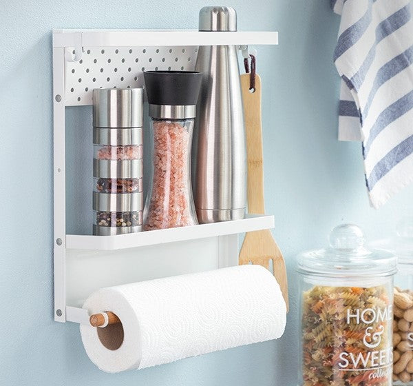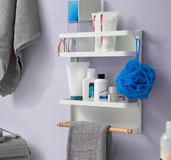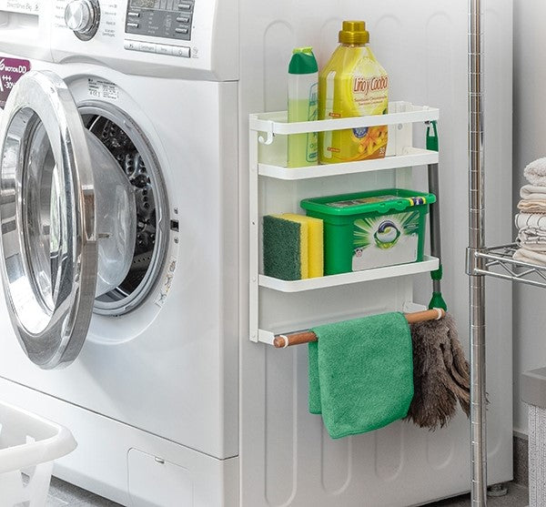 A multipurpose. versatile and robust magnetic organiser shelf which is extremely useful for optimising space in the kitchen. bathroom. etc. and for having all types of objects. such as jars. tins. kitchen paper. cloths. towels. kitchen utensils. cleaning products. etc.. to hand. It has two shelves that can be folded easily. a safety rail to prevent some objects from falling. two mobile hooks and a wooden rail for rolls. cloths. etc. It saves space and keeps things tidy. can hold up to 5kg of weight and is ideal for placing on the fridge. on the side of the washing machine or tumble dryer. etc. Thanks to its innovative magnetic design. it is very easy to install as it sticks easily to metal surfaces and does not require assembly or tools. although if you prefer. it has 2 holes for hanging it up (includes 2 plugs and 2 screws).
