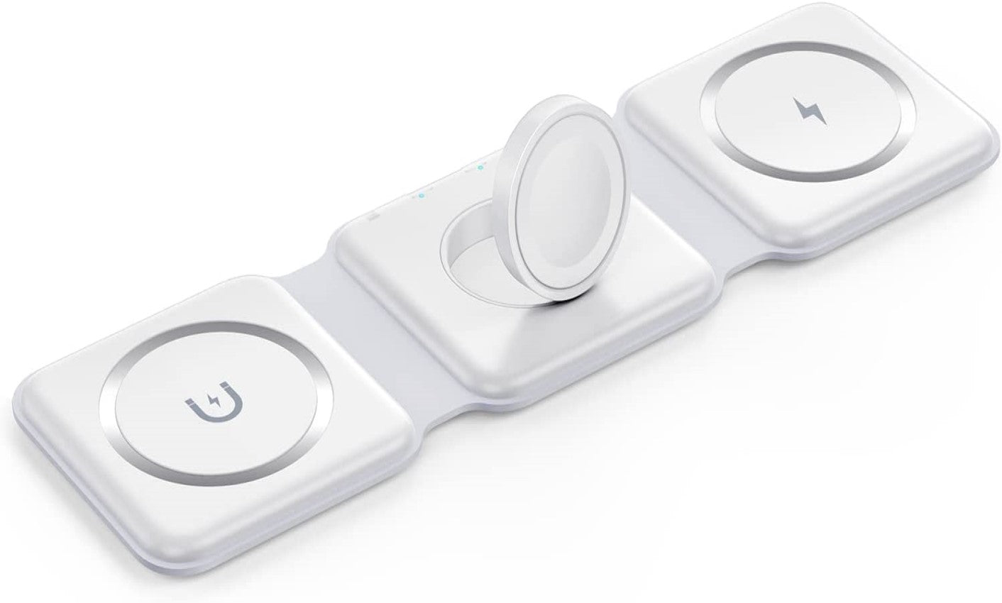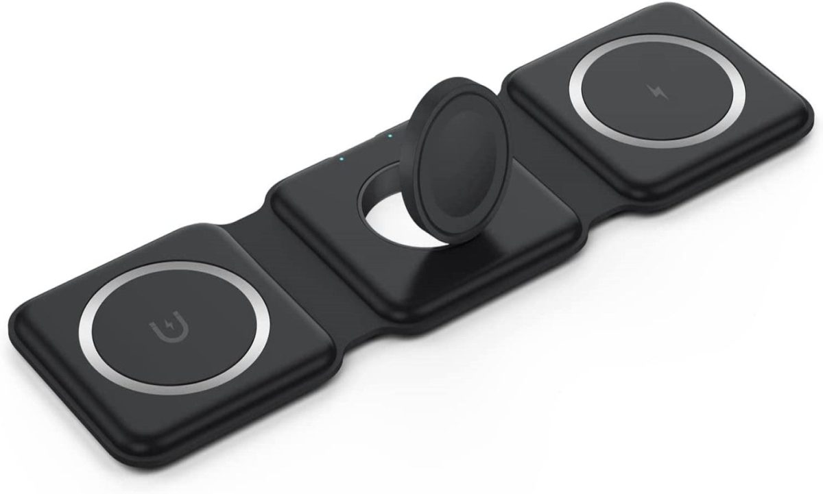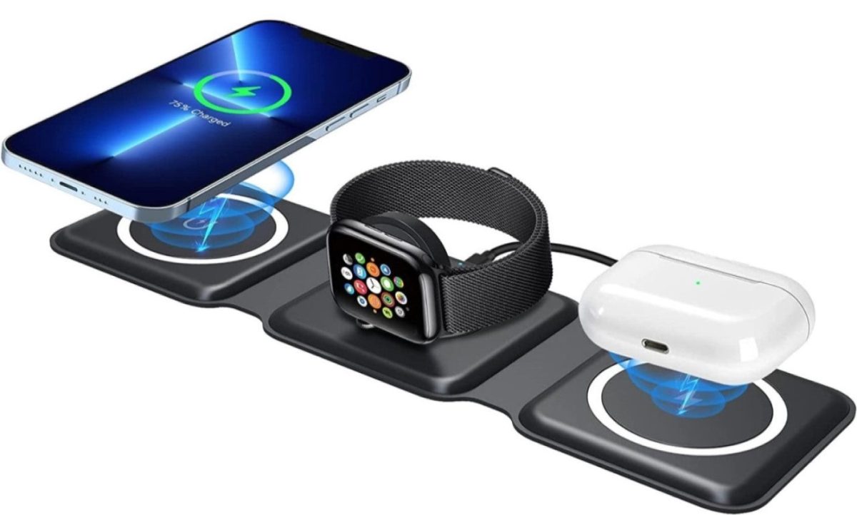 ✔ FOLDABLE DESIGN: With ease. smoothly fold it into a phone stand or lay it out flat to charge 3 devices at once. or fold it away for when it is needed. Designed with a slim interchangeable charger that is convenient for all! Inside the soft-touch silicone. holds our advanced magnetic charging technology. It can magnetically stick to iPhones with MagSafe capabilities.